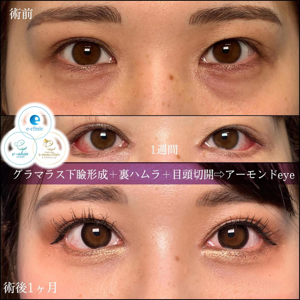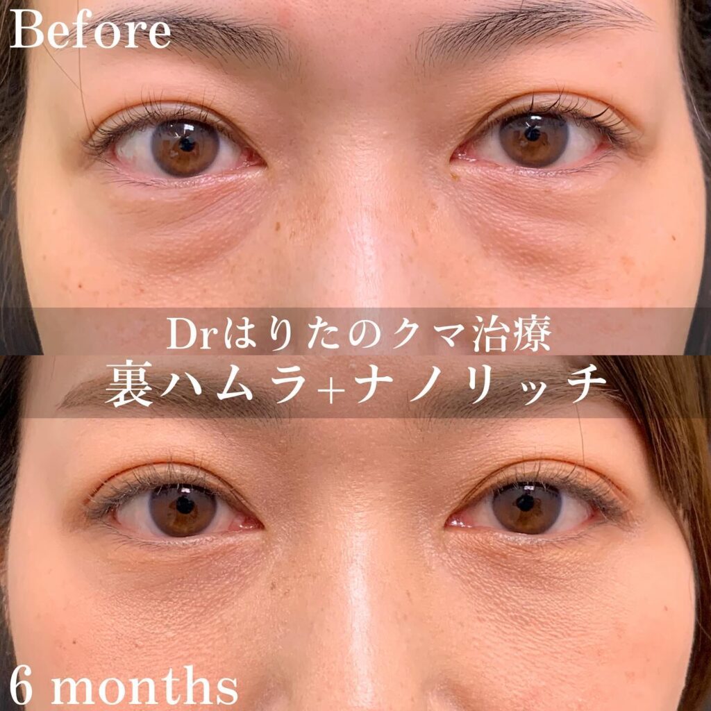 裏ハムラ法と比較して経結膜脱脂はダウンタイムが短く、今回の症例のように3日で腫れが引くこともあります。また、ヒアルロン酸は目元のくぼみ解消に効果的です。色素沈着によるクマも目立ちにくくなります。