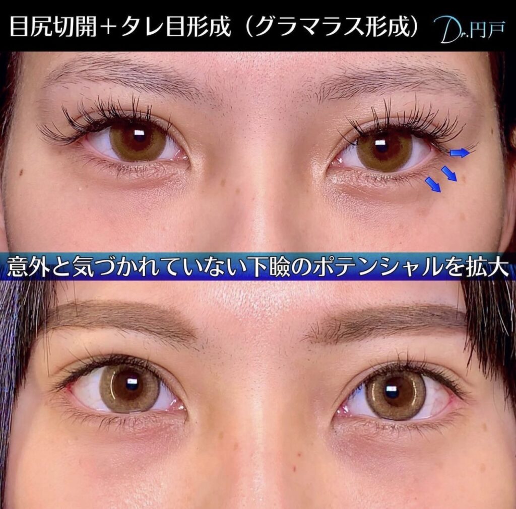 タレ目形成とグラマラスライン形成は、どちらも目尻を下げて優しい印象を作る手術です。クリニックによって名称や呼び方は異なりますが、基本的に「目尻にアプローチする手術(施術)」であることは変わりません。
