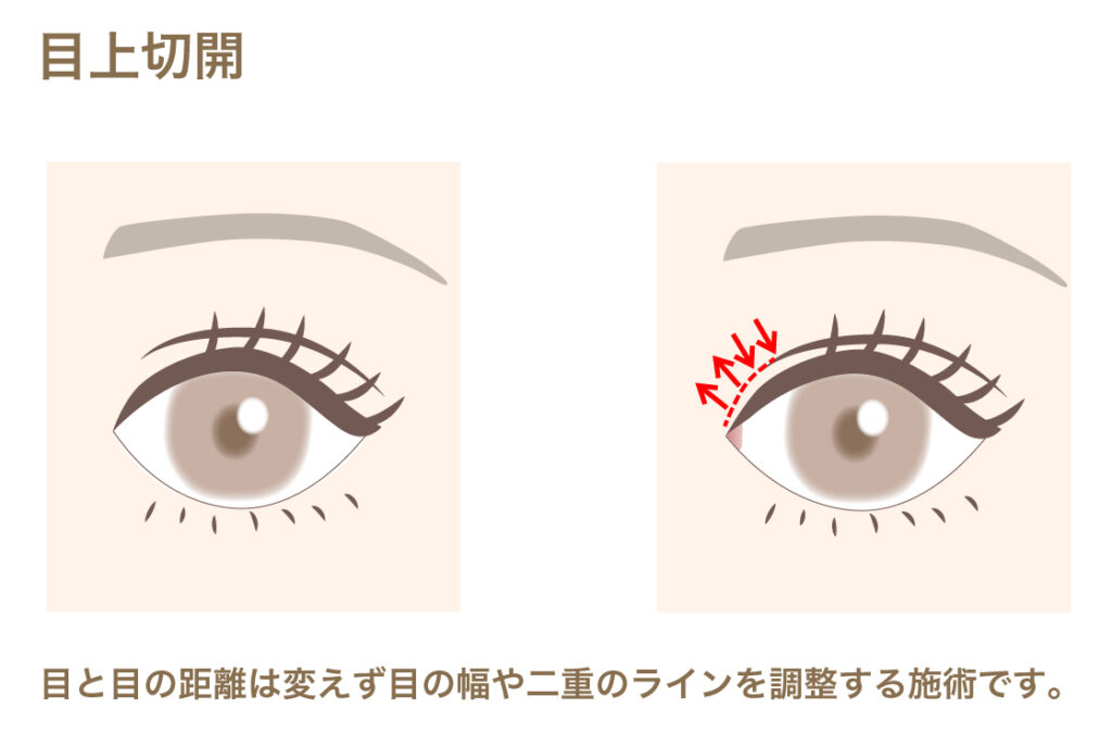 目上切開とは、「蒙古(もうこ)ひだ」の上部を切り取ることで、目と目の距離を変えずに目を大きく見せる術式です。寄り目にせbずに目を大きく見せたい人におすすめです。