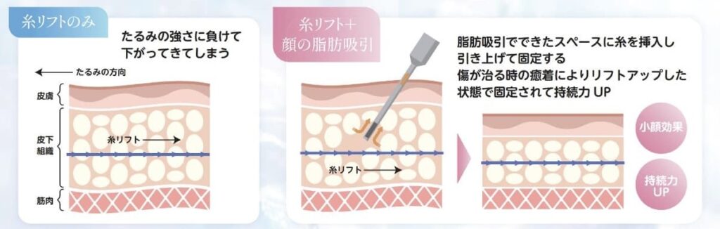 糸リフトは時間とともに効果が落ちますが、脂肪吸引を組み合わせることでリフトアップの土台がしっかりと維持されます。さらに、ヒアルロン酸でバランスを整えることで、より自然で長持ちする美しい輪郭がキープできます。