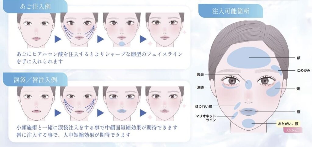 または、涙袋や鼻、唇などボリュームを足して顔のバランスを整えるためにヒアルロン酸を注入することで、前から見ても横から見ても洗練されたバランスの良い小顔が実現可能です。
